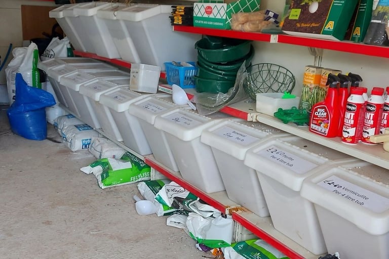 Labels, pea & bean netting, Phosphogen plant food, tomato feed, slug killer and Ant killer. Coated garden wire, raffia, twine/string, cable ties, multipurpose bag, Miracle Grow, children's gloves and cotton grip gloves ,bug spray, bean rings, various plant pots, hanging baskets 10", 12" and hanging basket liners.Growing pots - fibre - 12's, growing pots - fibre - 20's, grow tubes.Organic chicken manure, frost fleece, cloche tunnel.Pistol grip dibber and sieve scoop set.